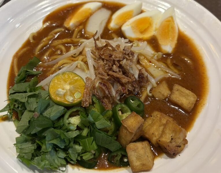 こちらはサツマイモやピーナッツを使用したソースで甘辛味。そしてこの甘辛くて、とろみのある濃厚なソースが黄色のエッグヌードル(通称イエローミー)にかかっています。具材はゆで卵、豆腐、揚げワンタン、ネギ、フライドオニオンなどがのることが多いです。